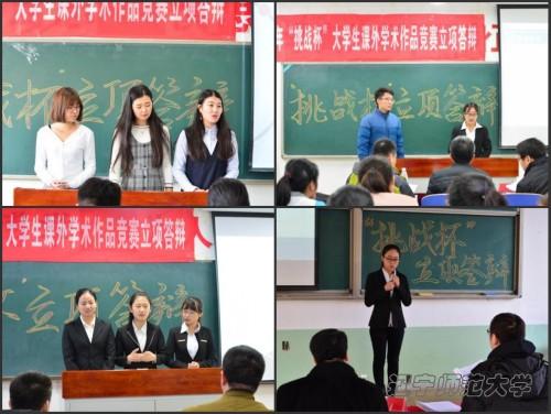 为了进一步提高我校参加 “挑战杯”赛事作品质量,促进校园科研学术交流氛围,12月10日,辽宁师范大学2017年“挑战杯”大学生课外学术作品竞赛立项答辩分别在理化楼C区与外语楼一合教室依据项目类别进行。评审组共分为四类五组:哲学社科组(A.B)、地理化学生科组、物理信息和科技发明组、法学组。